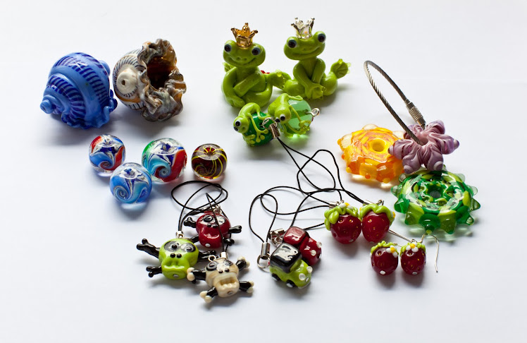 Ich arbeite auf einem Carlisle, links davon ist ein Concinekt Brenner zu sehen. Oben befinden sich Glasstäbe von Effetre, Lauscha und Ornella. Meine Silbergläser und ganzen Glasstangen sieht man auf den Bildern leider nicht...